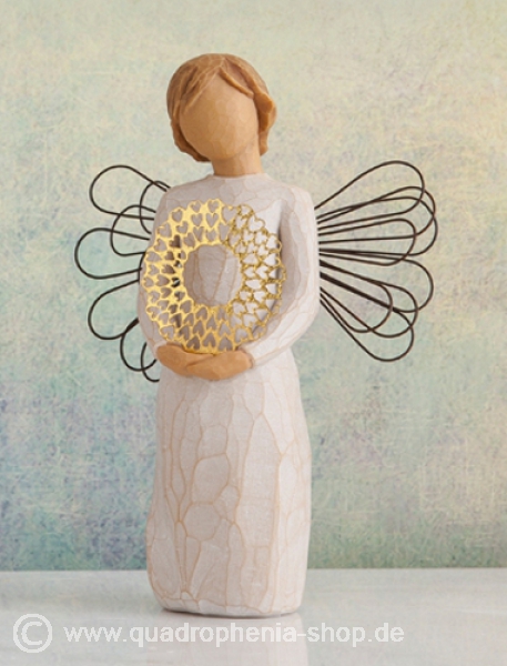 Susan Lordi: „Ich mag das Strukturieren von Metall. Der Kranz ist seit jeher ein Symbol der Gastfreundschaft und Willkommenseins .Dieser Kranz ist dekorativ, leicht und feminin. Die Stimmung unbeschwert ….zärtlich – ein Weg, Danke zu sagen oder lassen Sie jemanden wissen, dass sie / er etwas Besonderes ist. Susan Lordi’s Figuren spiegeln eine Eigenschaft oder ein Gefühl wider, z.B. sich Menschen nahe zu fühlen oder Beziehungen mit ihnen zu schätzen. Susan Lordi legt viel Wert darauf, dass ihre Willow Tree Figuren Gefühle ausdrücken. Sie stellt diese in einfachen, reinen Gesten und Körperhaltungen dar. So vermitteln Dir die Figuren Verbundenheit zu anderen Personen, Ruhe, Frieden, Schutz, Trost, Ansporn und Liebe, auch denen, die Dir nahe stehen. Ein Geschenk das von Herzen kommt! Die Vorlagen für alle Willow Tree Figuren wurden von Susan Lordi von Hand geschnitzt. Dieser Artikel ist neu und originalverpackt. Die liebevoll gefertigten Figuren bestehen aus Polyresin, sind handbemalt und fühlen sich an wie aus Holz.